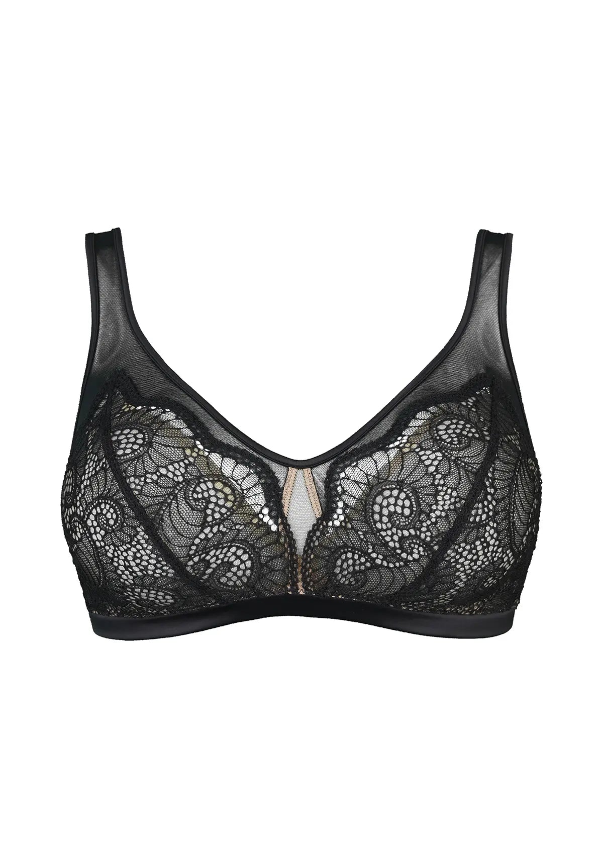 - Décolleté en dentelle doublée en tulle nude